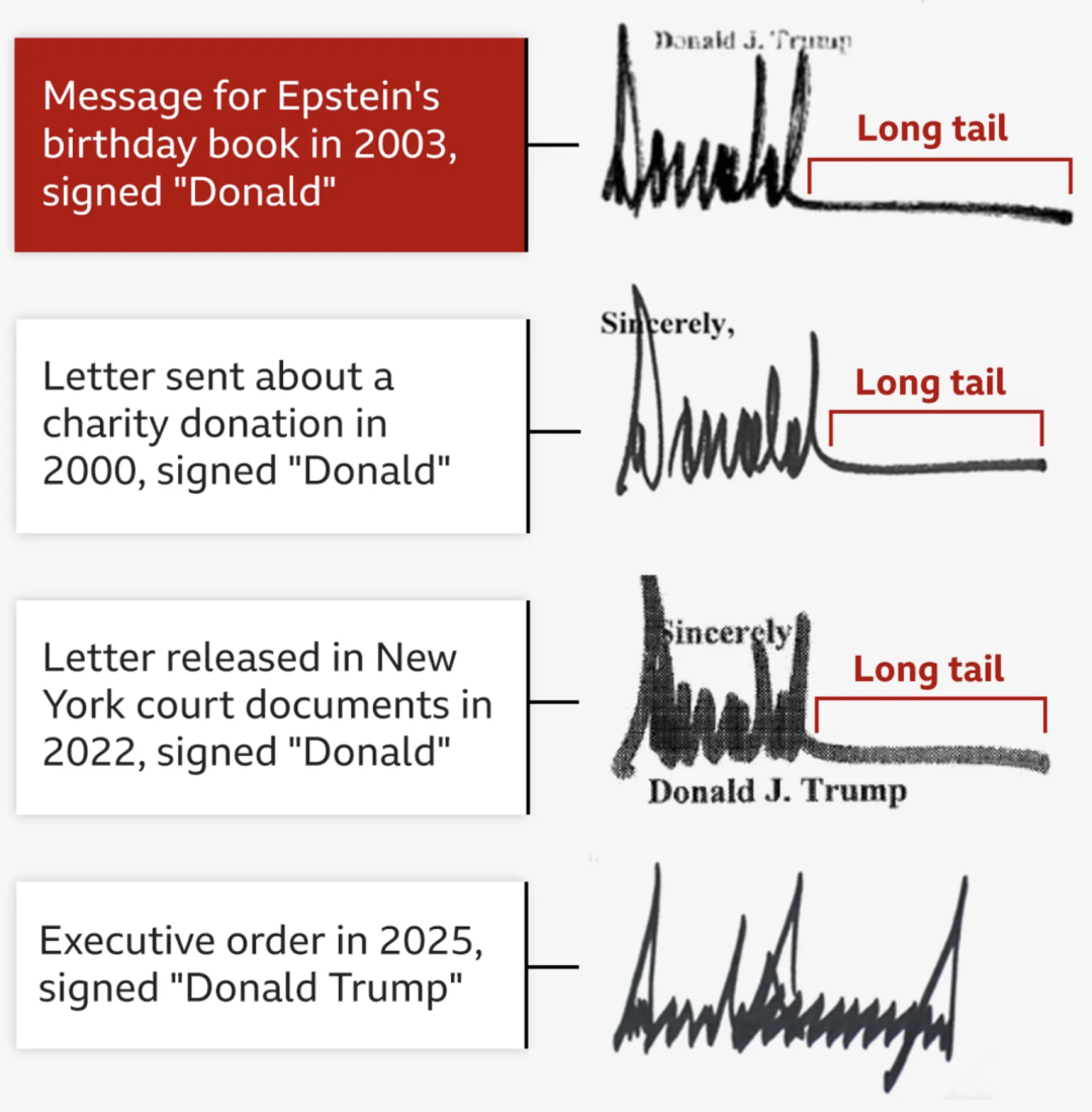 (由上到下:本次曝光的川普签名、2000、2022、2025不同年份的川普签名)