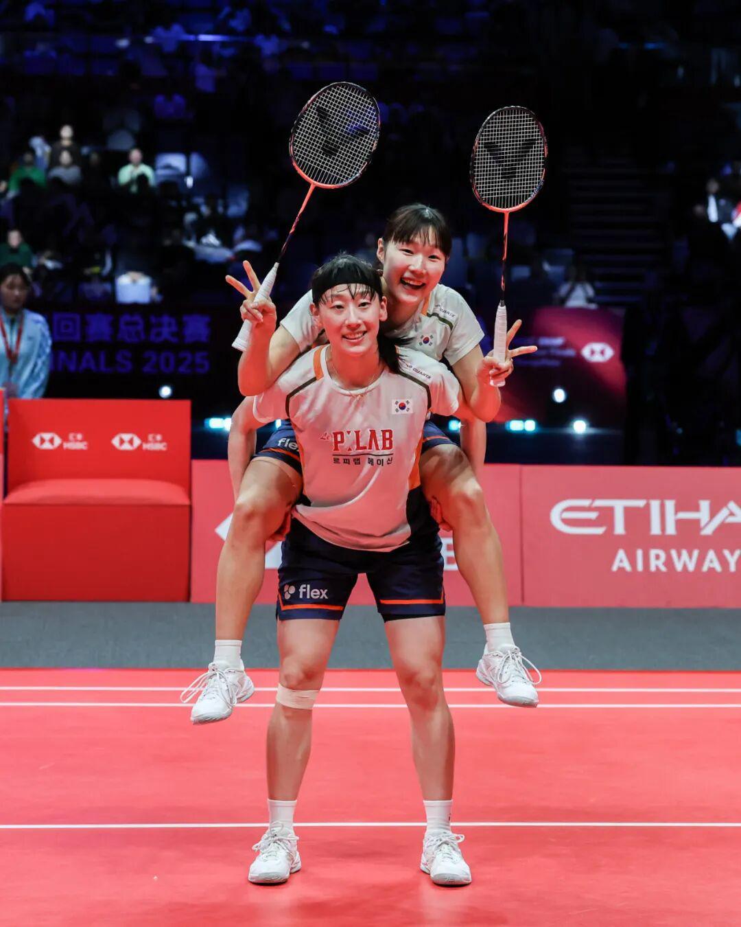 韩国女双李绍希/白荷娜在决赛中以2比0战胜对手,成为总决赛十几年来又一对卫冕成功的女双组合。