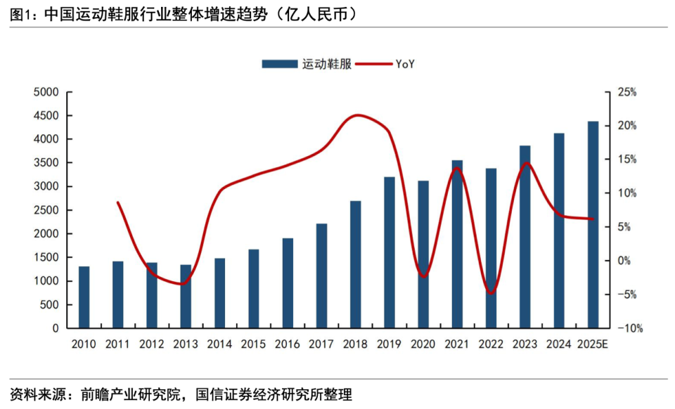 据国信证券研报,2025年中国运动鞋服市场规模约4400亿元,2024和2025年行业增速分别为6.8%和6.1%。