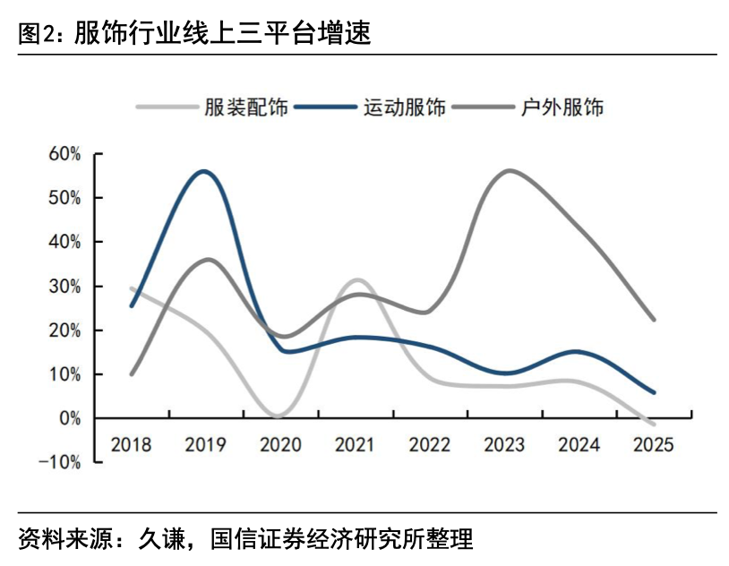 值得注意的是,2019-2025年,运动服饰与户外服饰的线上销售增速始终高于服装配饰整体,在近两年线上增速整体放缓的背景下,运动服饰和户外服饰表现仍然占优。