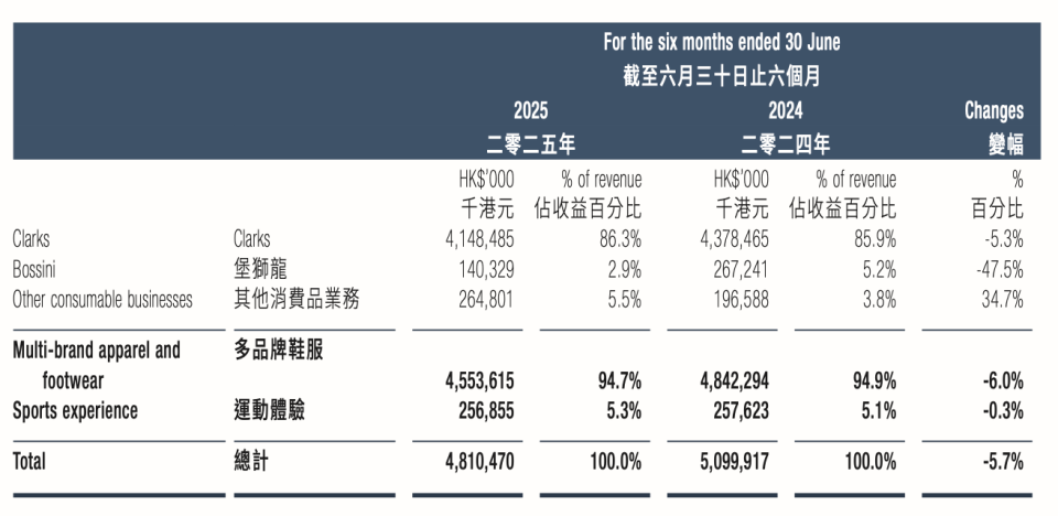 据非凡领越2025年半年报,其综合收益较去年同期跌幅为5.7%,减少至48.1亿港币。财报披露收益减少主要系多品牌鞋服的收益减少所致,尤其是Clarks及堡狮龙业务。