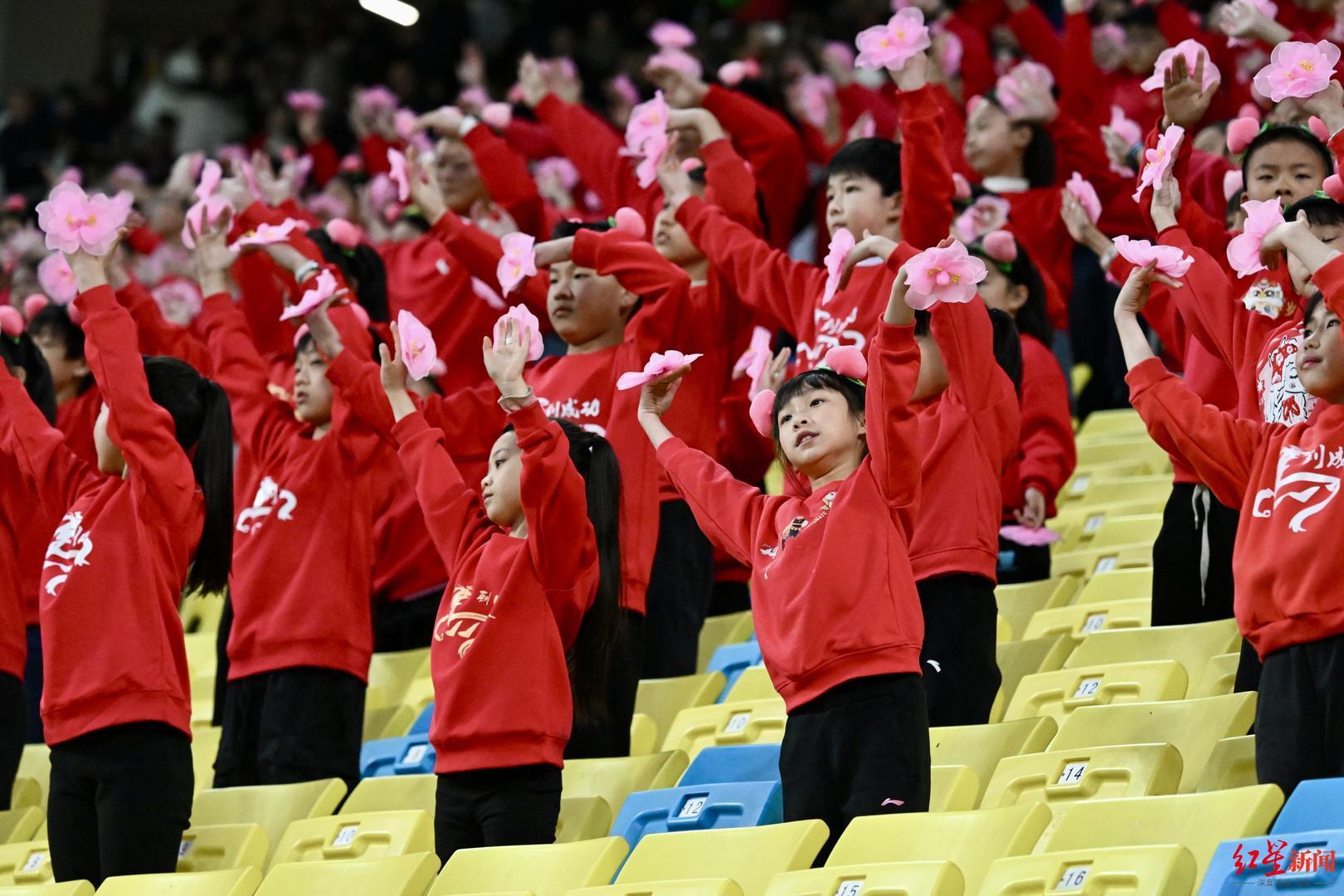 今晚的凤凰山,“公益”也是一大主题。蓉城主场固定的公益看台邀请了近600位来自龙泉驿各中小学的同学们,目前正是龙泉驿桃花烂漫时,同学们有的戴着桃子形状的头套,有的戴着桃子发箍。来自成都市龙泉驿区师上学校的高鹏睿是学校足球队的队员,他也借这次来到凤凰山的机会向成都市民发出邀约:“希望这个春天,大家能到龙泉驿区赏花。”